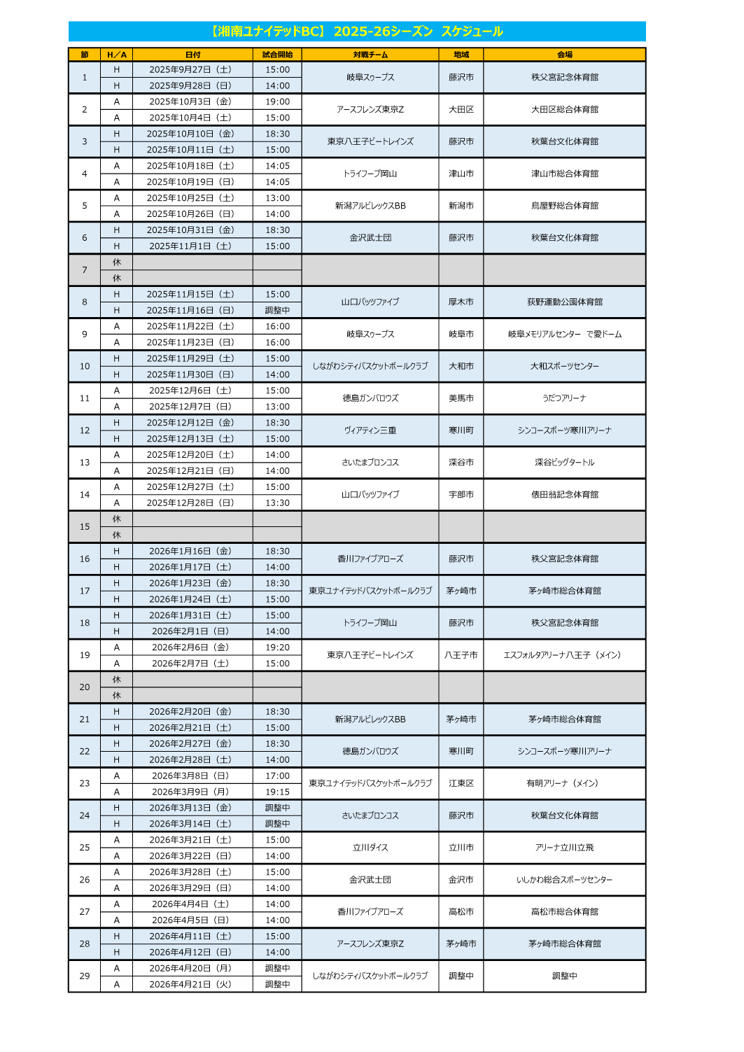 2025-26シーズンのスケジュールにつきまして、7月7日に対戦カード、会場をお知らせいたしましたが、本日、試合開始時間が決定いたしましたので、お知らせいたします。