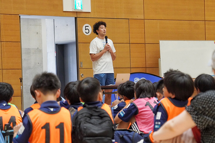 このプロジェクトでは、タレント育成能力開発プログラム内の一環としてHC、選手がトップアスリート講話を行い、その後、実技講習として全員にバスケットボールを体験していただきました!