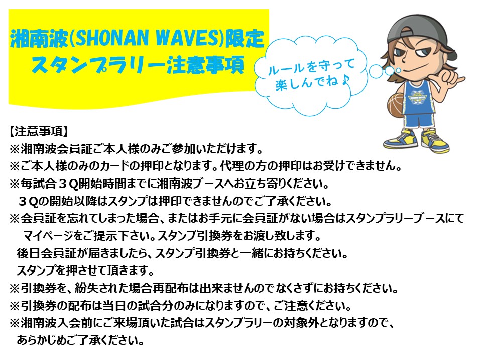 ※毎試合3Q開始時間までに湘南波ブースへお立ち寄りください。3Qの開始以降はスタンプは押印できませんのでご了承ください。