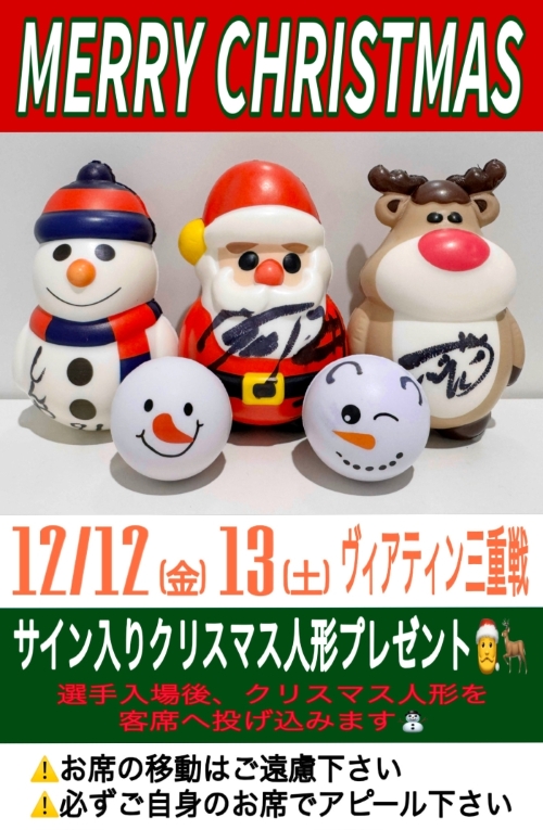 各日、選手入場・ハドルの後に「サイン入りクリスマス人形」を投げ込みます!