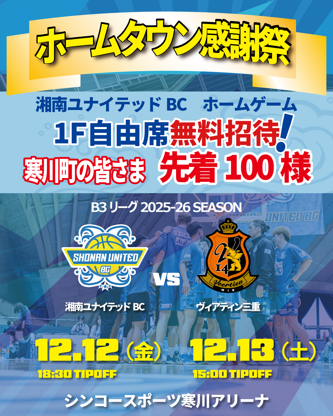 12月12日(金)、12月13日(土)に開催いたしますB3リーグ 2025-26シーズン 第12節「湘南ユナイテツドBC vs ヴィアティン三重」の試合で「ホームタウン感謝祭」を実施いたします。