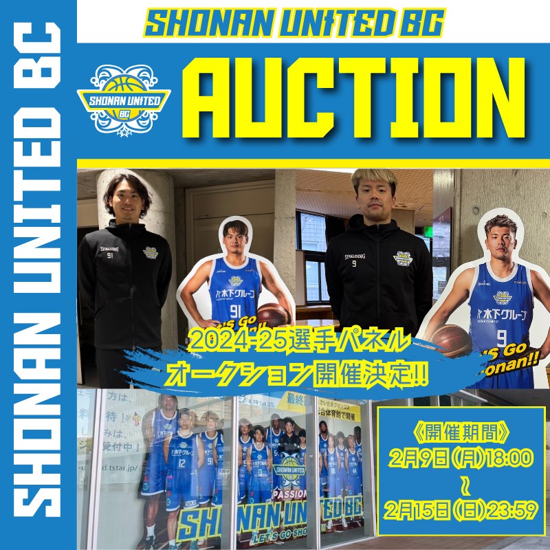 湘南ユナイテッドBCでは、 2024-25シーズンにパートナー企業や体育館にて設置していた「選手パネル」の、オークションを2月9日(月)より実施することとなりましたのでお知らせいたします。