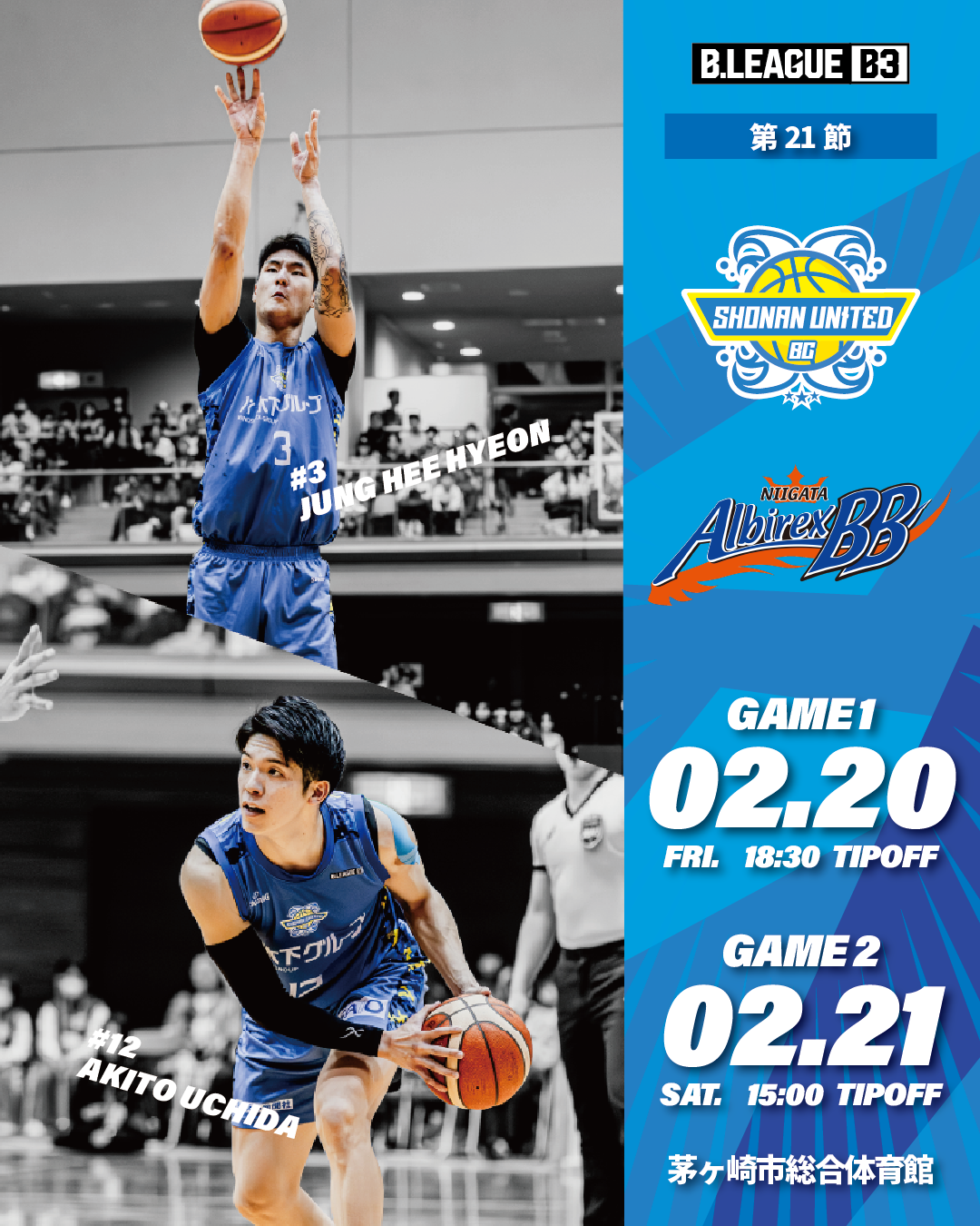 B3リーグ 2025-26シーズン 第21節(ホームゲーム)/2月20日(金)、2月21日(土)@茅ヶ崎市総合体育館のゲーム情報をお知らせいたします