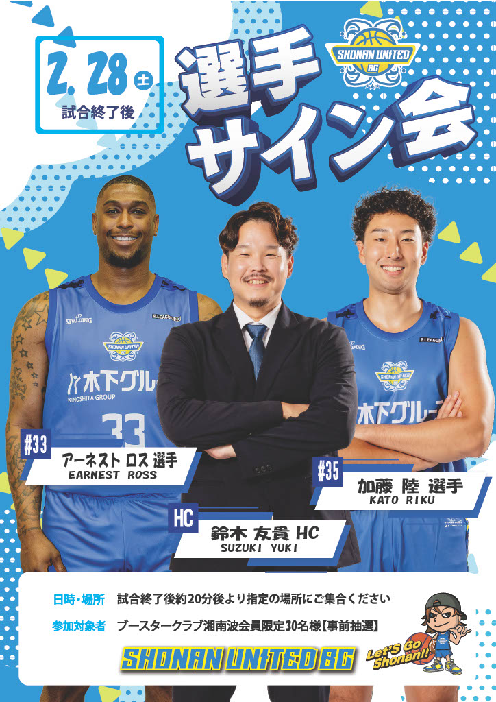 Game2の試合終了後に、湘南波(SHONAN WAVES)会員限定(抽選)でサイン会を行います。(抽選で30名さま)